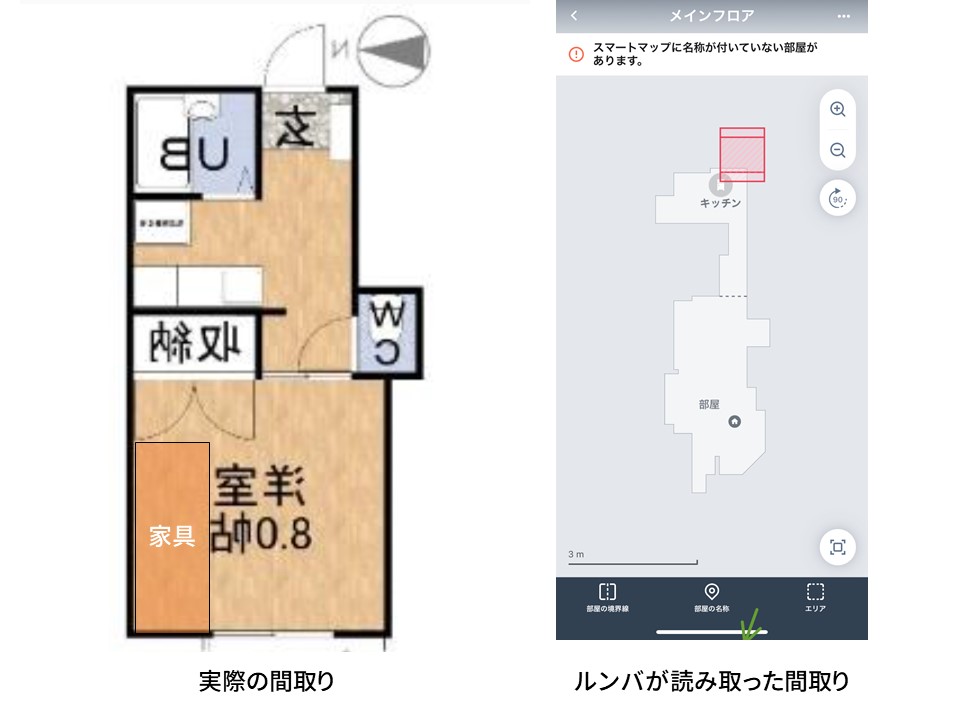 こちらは、私の部屋の実際の図面と、ルンバが読み取ったスマートマッピング図です。