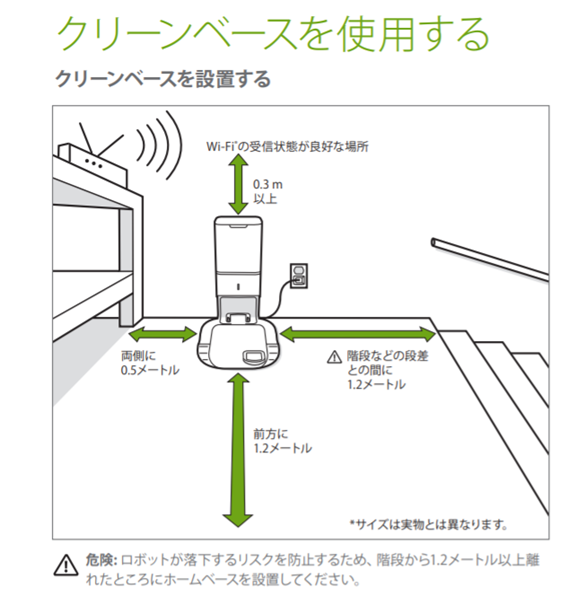 以下の写真のように、クリーンベースは、両側0.5 m、前方1.2 m、上に0.3 m空間を開けなくてはなりません。